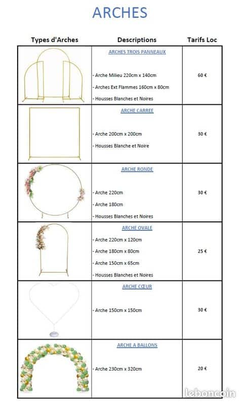 ARCHES Structure Arche Ballons 3mx2,30mArche Dorée Ronde 2,20mArche Ovale simple ou 3 panneaux d’1m50 à 2m20 de hauteurArche Carrée de Table AjustableArche Carrée de 2mStructure Arche Coeur 1,60mx1,50mStructure Colonnes Ballons 2,15m Demandez votre devis ci-dessous Veuillez activer JavaScript dans votre navigateur pour remplir ce formulaire.Veuillez activer JavaScript dans votre navigateur pour remplir ce formulaire.Identité *PrénomNomE-mail * E-mail votre dessous Écrivez votre demande ci dessousEnvoyer